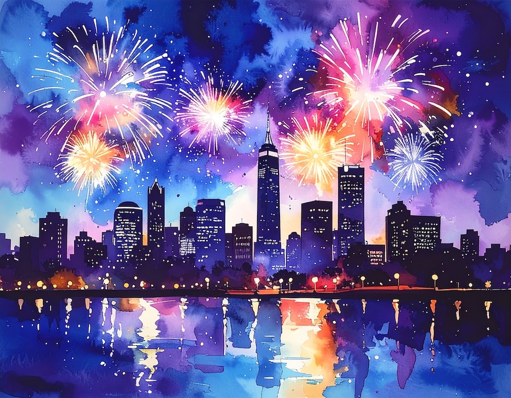 La fluidité et l’intensité des encres acryliques sont idéales pour faire jaillir les effets de lumière festifs et faire vibrer le ciel nocturne. Elles permettent des effets de transparence, de fusion et de contraste qui évoquent les étincelles et les traînées lumineuses des feux d’artifice.