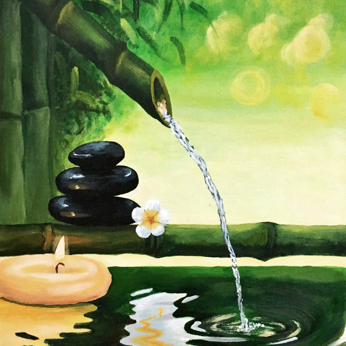 Ce cours de peinture vous invite à vous inspirer de quelques détails typiques du jardin zen pour réaliser votre composition picturale, comme les pierres, une fontaine, du bambou et les bougies.