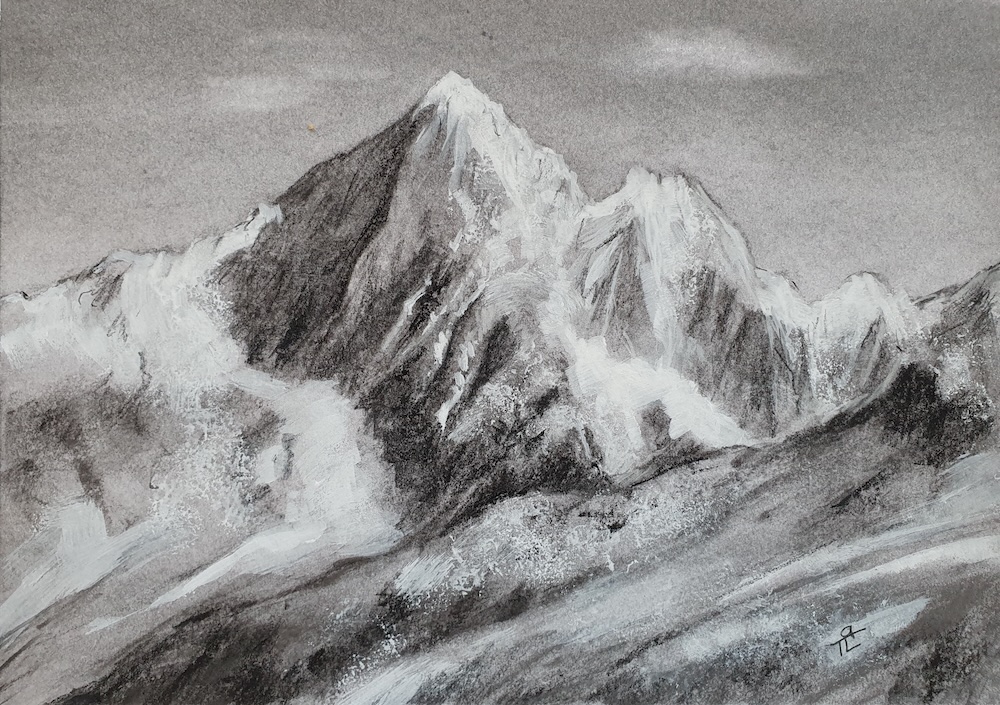 Le noir fusain, un outil de dessin intemporel et polyvalent, se révèle être le compagnon idéal pour explorer toutes sortes de valeurs de gris et des noirs profonds. Associé à d’autres techniques, telles que la graphite et la gouache, il vous permettra de créer un paysage de montagne saisissant, riche en contrastes et en textures, où les sommets enneigés se dressent vers le ciel et les vallées ombragées s’étendent à vos pieds.