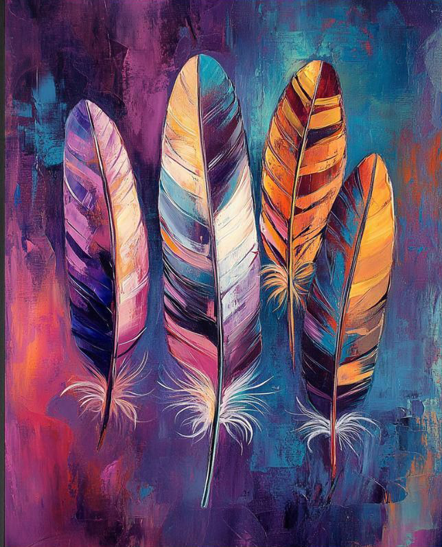 La peinture acrylique s’adapte aisément à la thématique des plumes, car elle permet de capturer la légèreté et les détails délicats de ces sujets. Grâce à sa texture fluide et ses temps de séchage rapides, l’acrylique permet de superposer des couches fines pour représenter la transparence et les nuances de couleur qui caractérisent les plumes. Les peintures acryliques peuvent également être manipulées pour créer des effets de texture, permettant de simuler la douceur ou la rigidité des plumes, tout en offrant une gamme étendue de couleurs vives pour exprimer la diversité des significations culturelles.